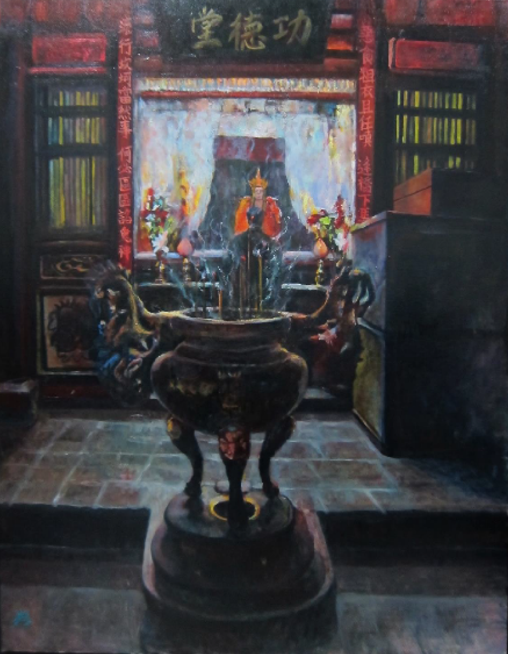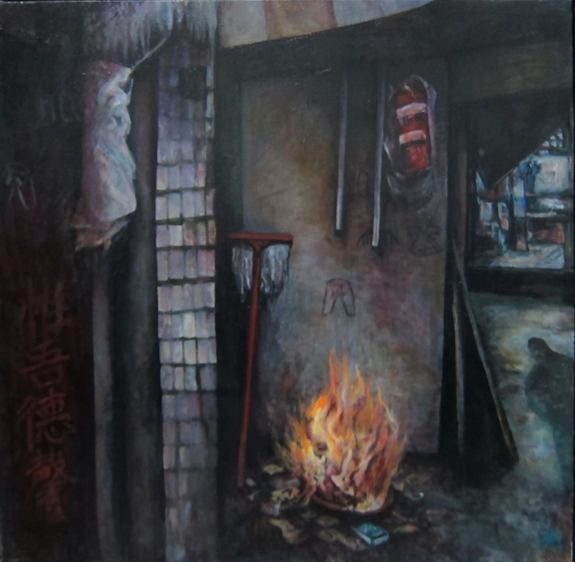 我喜歡從日常生活中擷取各種元素作為符號:紙錢、爐鼎、報紙、手機、公車亭、路燈、招牌燈、照片拼貼……
